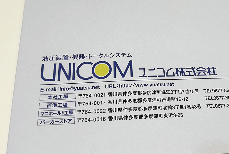 立体的なデザインのモチーフは、「マニホールドブロック」という油圧の回路を構成する、金属でできた立方体の部品です。この部品を自社で製造できることはユニコムさんの強みのひとつであり、今後さらに力を入れていく事業であることから、そこに着想を得ました。配色は、これまでのロゴマークで使われていた黄色と、ユニコムさんを象徴するキーワード「質実剛健」からイメージした紺色の2色。書体とUNICOMの「O」の内側に配した黄色は、リニューアル前のロゴからの引用です。