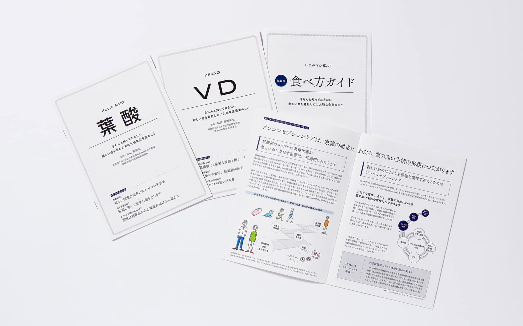 妊娠・出産における、さまざまな栄養素の役割をエビデンスとともに紹介している、医療機関用パンフレット。食事による栄養摂取を大切に、サプリメントの補助を活用いただけるよう、誠実でアカデミックなトーンの小冊子をデザインしました。