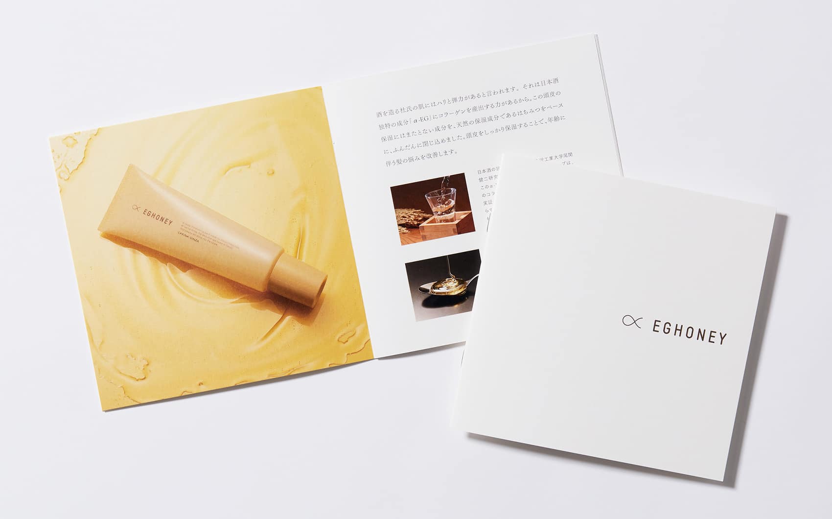 EGHONEYという名前は、日本酒由来成分「α-EG」にちなんで設定。ロゴはαマークをシンボルとして採用しました。サロン発プロダクトとしての信頼感が伝わるよう、上質なトーンと情報量のコントロールをしています。