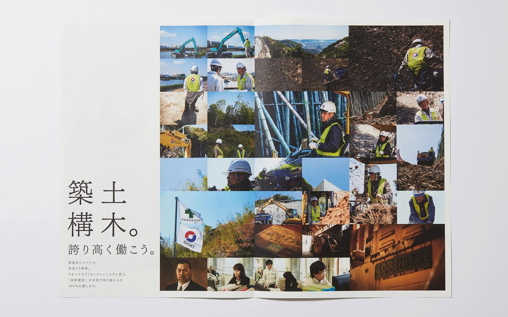 高知県の現場にて、社員の皆さまにご協力いただき撮影しました。実直に業務に向き合う姿を写真に収めることで、尾崎建設らしい現場の空気感を伝えています。また高知県第1号のロードローラーを収めたビジュアルは、同社の歴史を雄弁に語っています。
