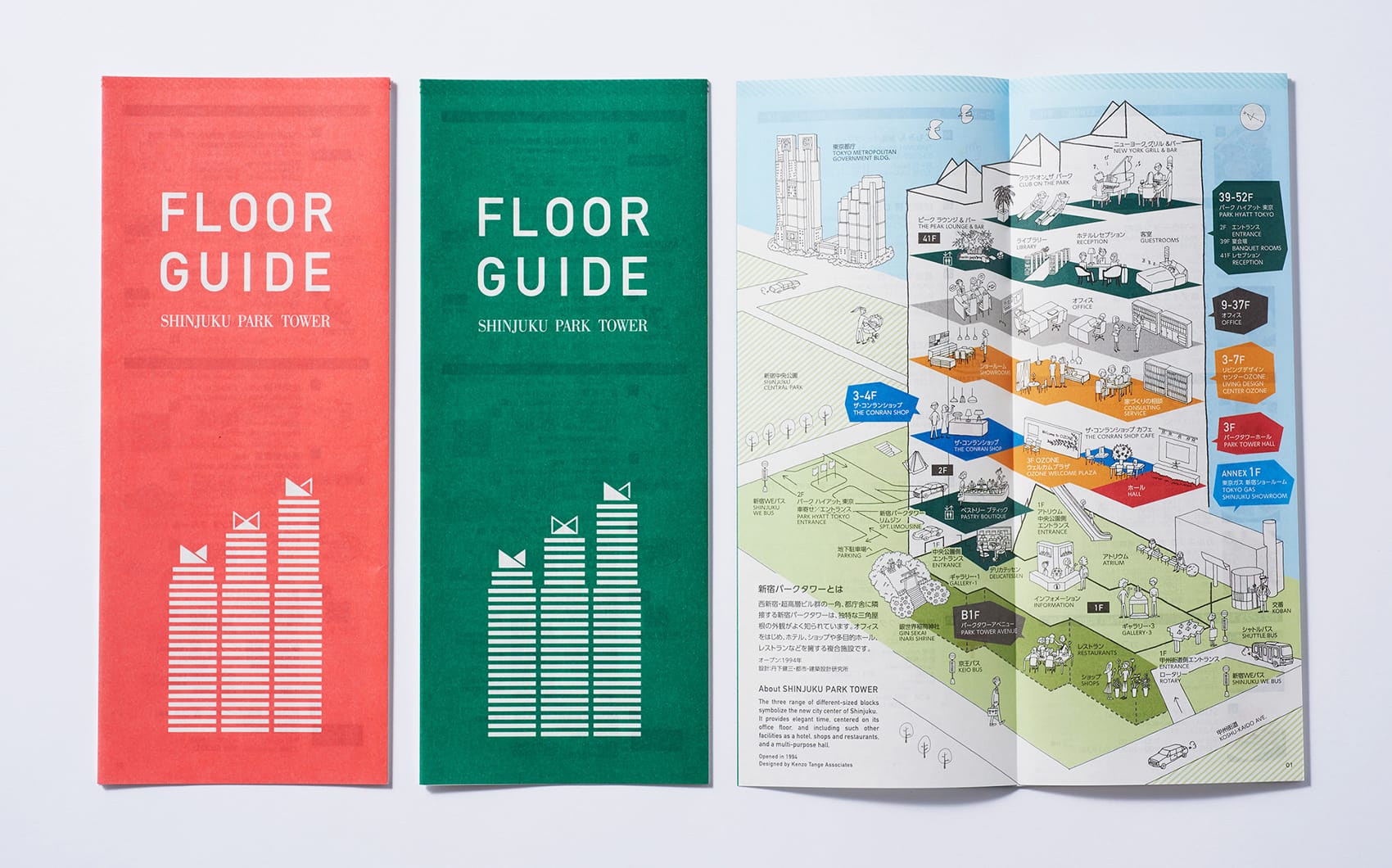 フロアガイドは2001年以降、その時々の課題に応じ改定を行いながら制作。今回は「新宿パークタワーの全体像をわかりやすく」という課題から、「ビル全体を俯瞰しながら見られるフロアガイド」に。親しみのあるイラストを用いて、位置関係が一目でわかるように工夫しました。サイズも女性が両手で広げても見やすいようデザインしています。