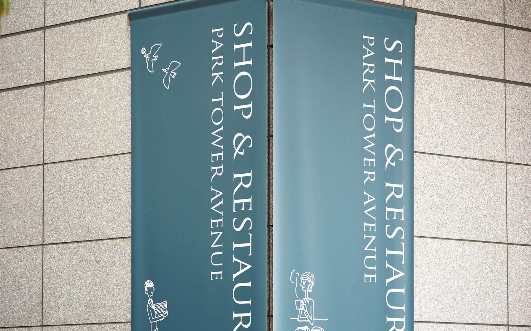 館内にあるフラッグも、デザイン・製造・取り付けまで担当。SHOP & RESTAURANTの入口フラッグには、館内の静かな世界観を損なわない色調と書体を踏襲しつつ、親しみやすい印象のイラストも使用しています。