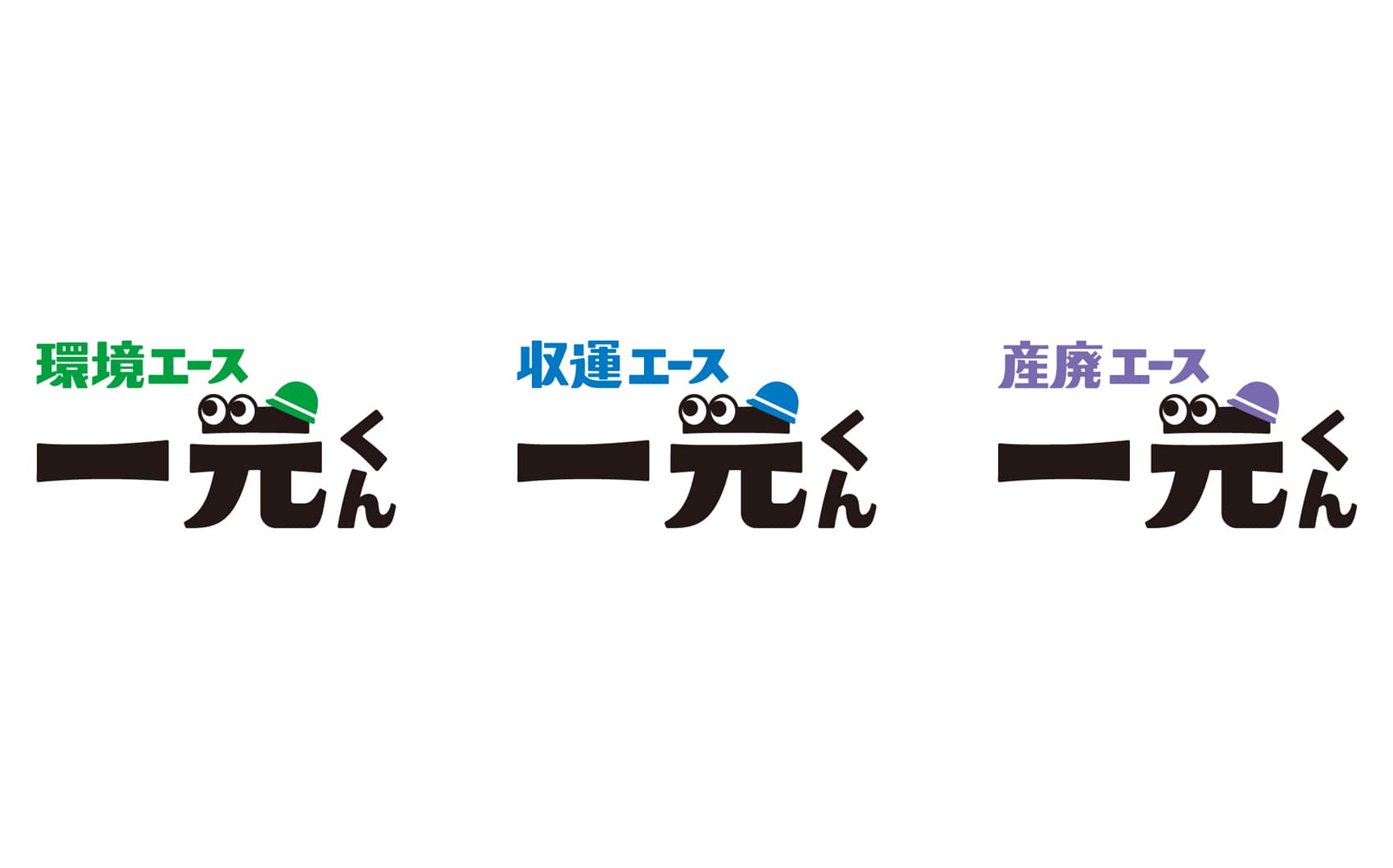 - 会社のエース社員をイメージし 「一元くん」の文字を擬人化したロゴデザイン。ヘルメットをかぶり、現場にいつでも駆けつける心強さを表しています。各サービスのカラーはそれぞれ、「環境エース」と「収運エース」は地球を表す緑と青、「産廃エース」は静脈・動脈産業がまじり合う紫を設定。「一元くん」という親しみやすい愛称で、社内外の人々に愛着を持ってもらえるようなデザインです。