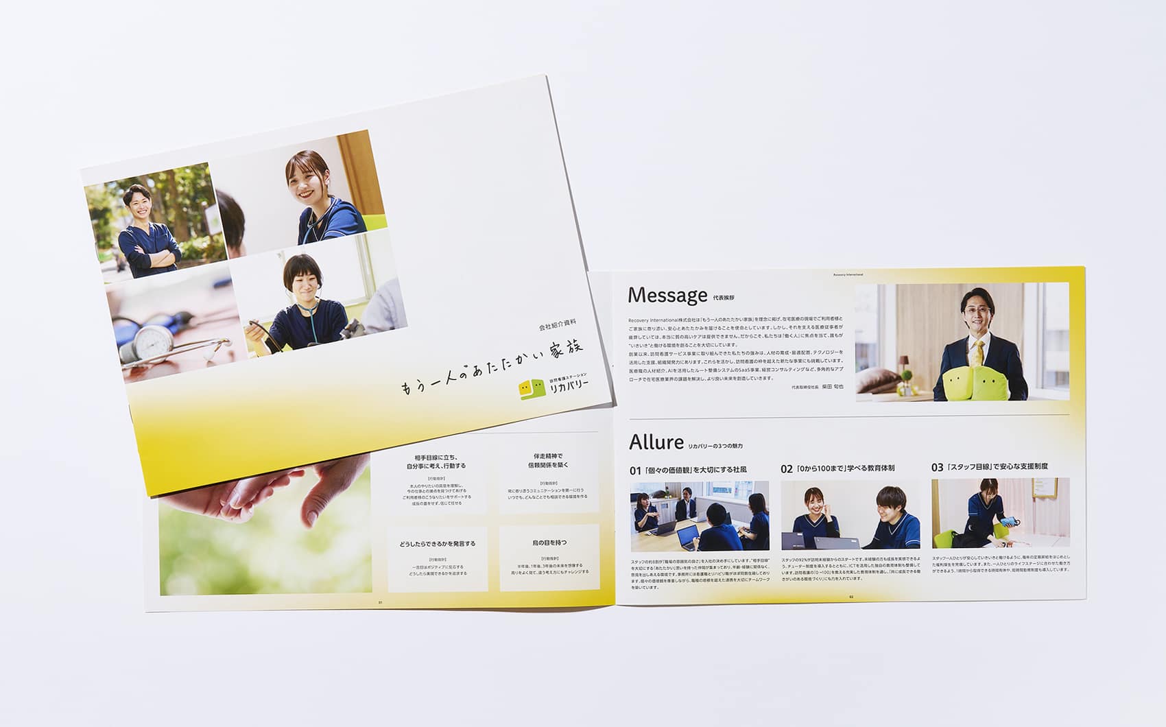 ロゴカラーのイエローとグリーンをそれぞれのパンフレットに使用することで、全体を通して統一されたブランドイメージを表現しました。また、人の写真を多用することで企業の素敵な雰囲気も伝えつつ、見る人が安心できるように構成しています。