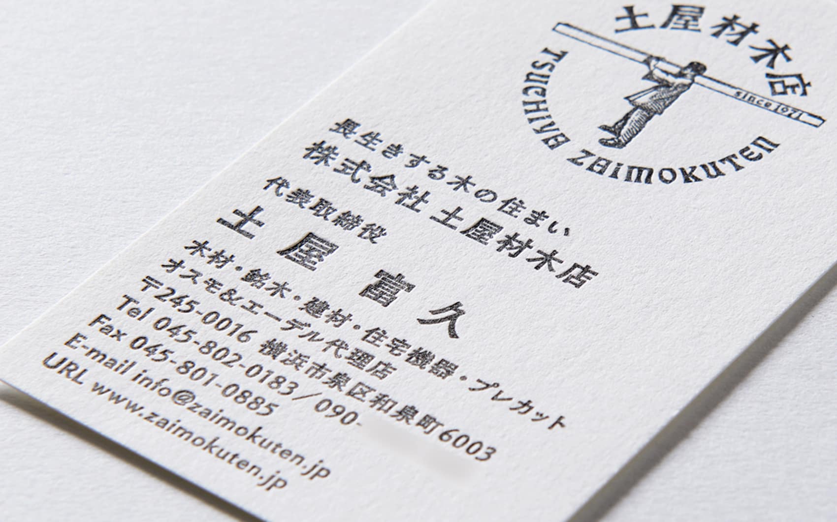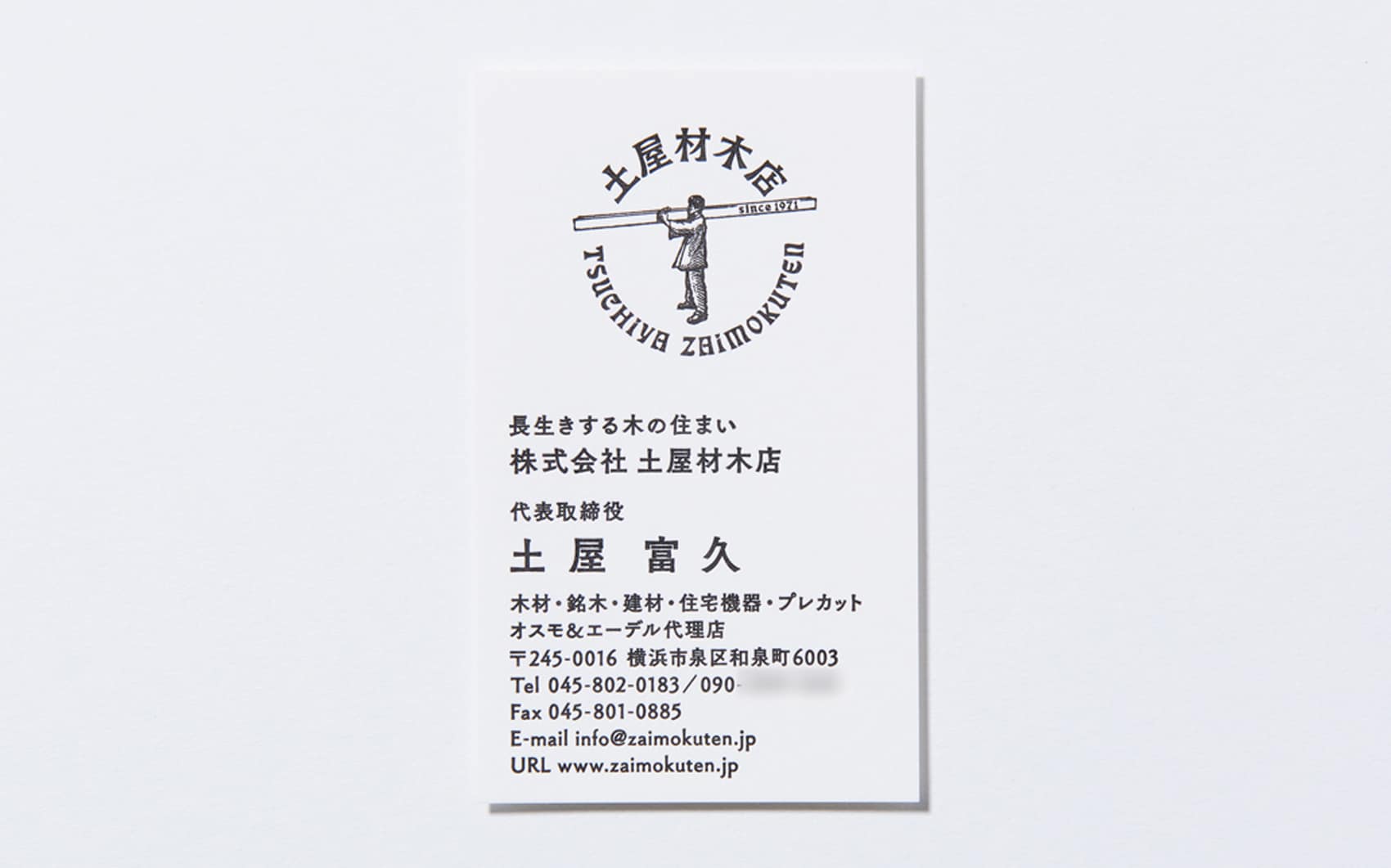 - 材木を担ぐ土屋様を描いてTに見立てたロゴマークで、古いエッチングを模したタッチは材木の温かみや自然の柔らかさを印象付けながら、力強さや歴史の重みも表しています。また、お客様のご要望に誠実に応え続けてきた真摯さも表現しています。